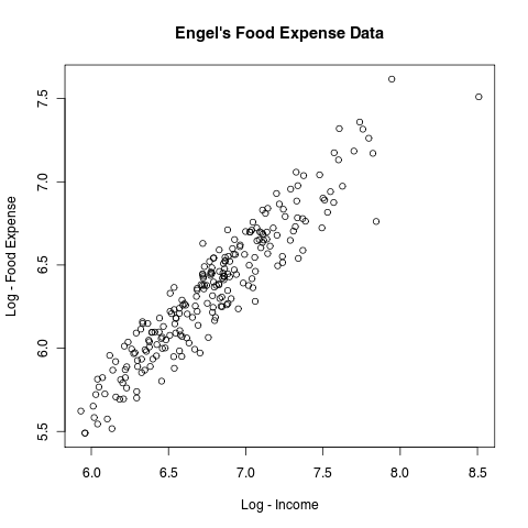 library(splines)Cargamos el famoso conjunto de datos de Engel (no el Engel de siempre; otro), que relaciona el ingreso con el gasto en alimentación de decimonónicos obreros belgas: