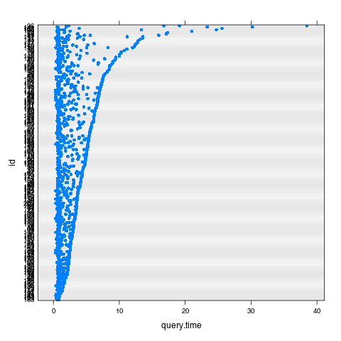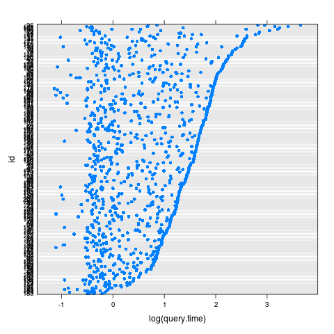 plot( groupedData( log(query.time) ~ 1 | id, data = dat ) )que produce la gráfica