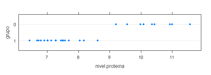 datos <- data.frame( nivel.proteina, grupo )Le he estado dando vueltas a la manera de representar gráficamente este tipo de conjunto de datos de la manera en que deben hacerse estas cosas: que con un mero golpe de vista pueda hacerse uno con ellos.