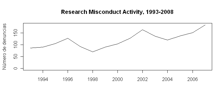 ¿Son significativos estos casos de fraude? ¿Son casos aislados? De la Office of Research Integrity, que monitoriza casos de mala conducta y fraude en publicaciones financiadas por el U.S. Public Health Service, extraigo la siguiente gráfica,