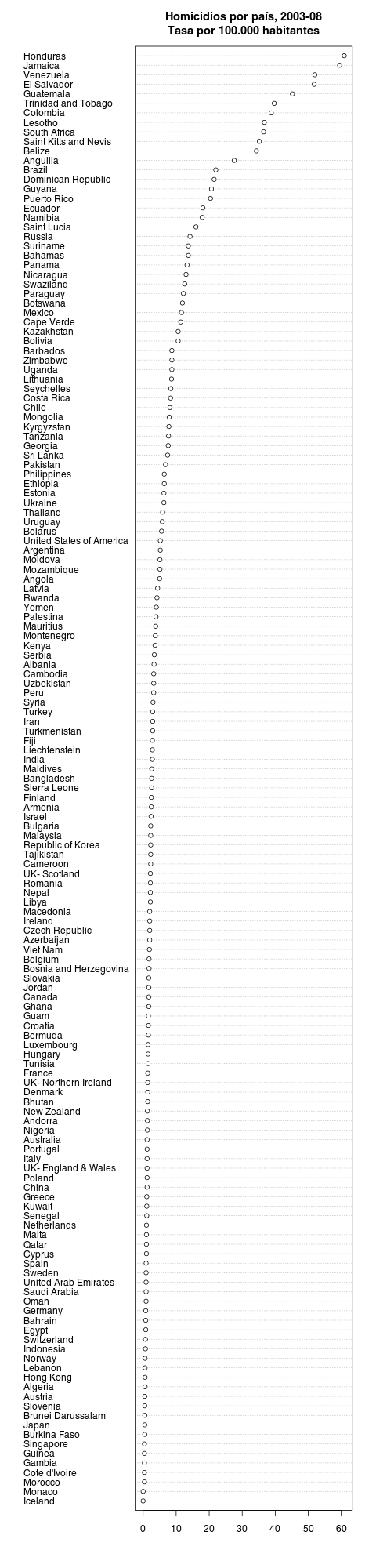 Me he entretenido en representar gráficamente algunos datos de la ONU referentes a homicidios y asesinatos (relativos a los años 2003-2008) y he aquí la figura resultante: