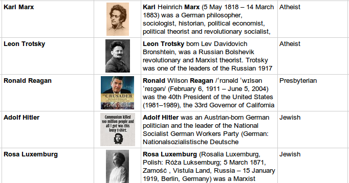 Pero, ¿qué pasa si uno quiere la lista de los comunistas más prominentes? En la fecha de la publicación de esta entrada, junto a Lenin, Marx, Stalin y Trotsky, aparecen Ronald Reagan y Hitler. Y de este último se dice que es judío (y es digno de mención, además, que en lugar de su foto aparece la del Che).