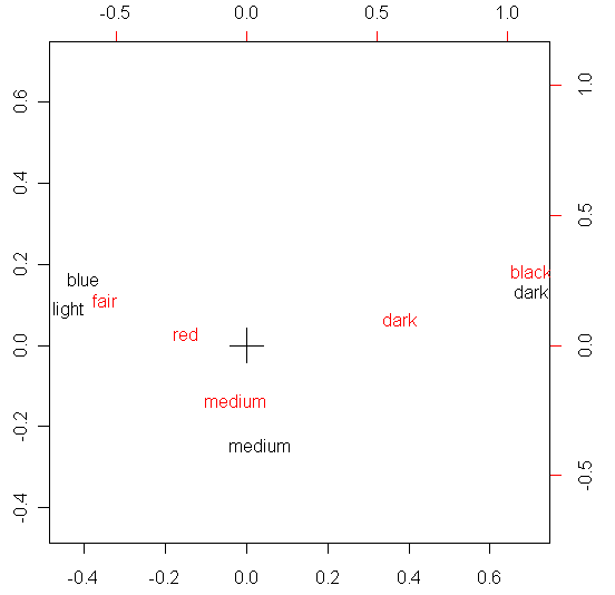De hecho, examinando las coordenadas Y (correspondientes a la segunda componente) podemos comprender mejor qué fenómeno recoge la segunda componente: una cierta sobreabundancia de personas con ojos claros y pelo oscuro y viceversa. Y a la vez, una proporción mayor de medium/medium de la que se deduciría únicamente de la primera componente.