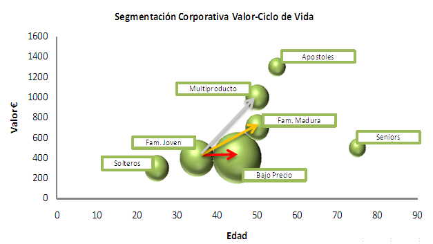 En él pueden los lectores ver los famosos clústers: el de los solteros, los apóstoles, los seniors, los multiproducto. Cada globo, entiendo, tiene un tamaño proporcional (¿en radio? ¿en volumen?) al tamaño del clúster que representa. Los ejes son la edad (horizontal) y el valor (vertical).