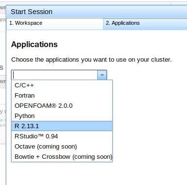 Después, selecciono el tipo de aplicación que quiero ejecutar (R, en mi caso):
