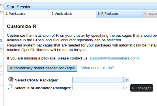Como he seleccionado R, tengo la opción de elegir qué paquetes añadir a mi instancia:
