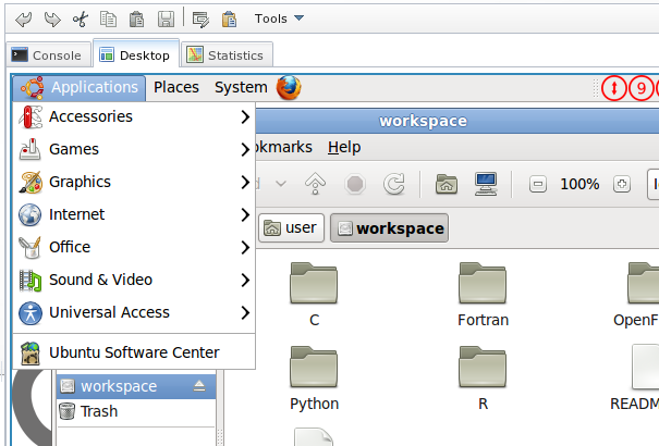 La pestaña desktop proporciona acceso al escritorio de una sesión de Ubuntu.