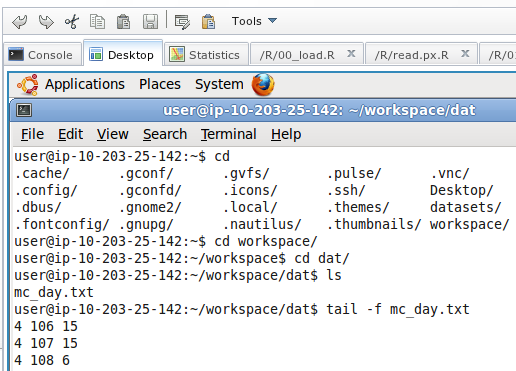 Puede apreciarse cómo los ficheros de nuestro workspace (que hemos subido previamente) están montados en una carpeta. Nuestra sesión de R puede leer y escribir en ella. En realidad, tenemos un Ubuntu corriendo en nuestro navegador, y podemos abrir cualquier aplicación: desde la terminal hasta un navegador (que hará las delicias de los amigos de la recursividad).