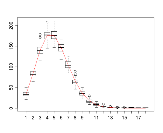 que es un diagrama de cajas del grado sobre el que se superpone el número esperado de nodos de grado k si se acepta que su distribución es de Poisson. Como puede apreciarse, coinciden. Pero ya lo sabíamos porque conocíamos de viejo la relación entre las distribuciones de Poisson y la binomial.
