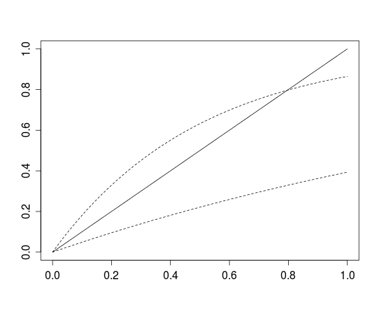 curve( 1 - exp( - 2 * x), add = T, lty = 2 )y z = 0.5