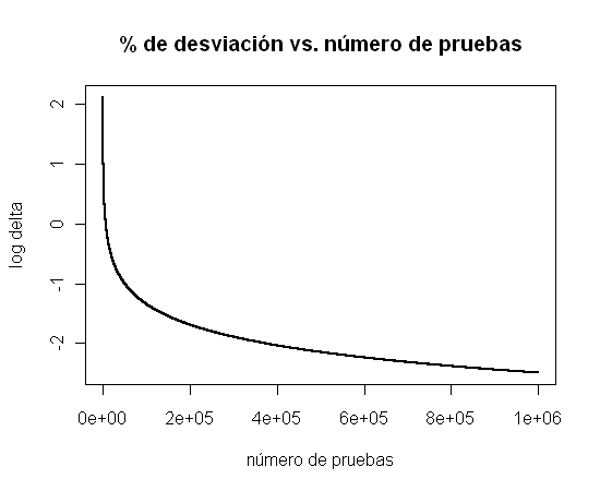 Pero vamos a ver si es cierto. Comenzamos seleccionando un número mínimo de pruebas, n.min y, para no caer en bucles infinitos un número máximo, n.max. Luego, usando el código