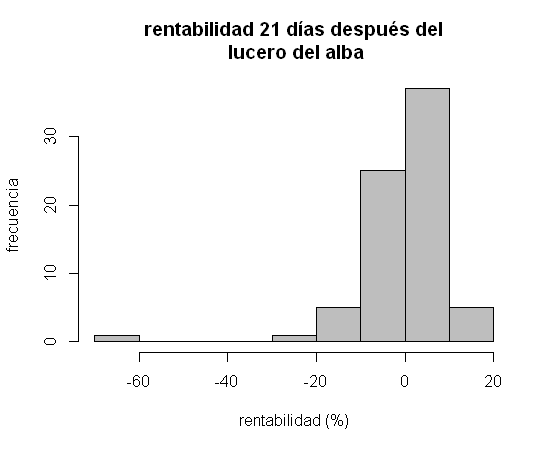 res.ms <- res.all[ res.all[,1] == 1, ]Y al cabo de un mes de los 78 luceriles prodigios ocurridos desde el 92, la rentabilidad acumulada por el IBEX 35 fue la indicada en el siguiente histograma: