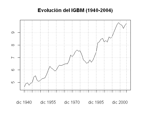 Se observa en la serie que 100 pesetas invertidas en tal año se convirtieron en casi 17000 en el 2004. La evolución (en escala lineal) del índice es: