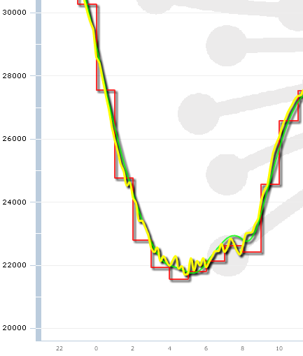 Por eso, siempre, antes de ponerla, echo un vistazo a la única fuente de información de la que dispongo, la página de REE. Por ejemplo, a la hora en que la hice funcionar, la madrugada del domingo, como a las cuatro de la mañana, el consumo de energía eléctrica en España tenía esta pinta: