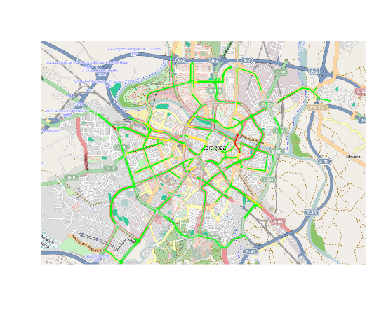 by(tmp, tmp$id, function(x) foo(x$lon, x$lat, status = x$status))Que da como resultado (a la hora en la que lo he ejecutado, cuando los zaragozanos están ya casi todos en su casa)