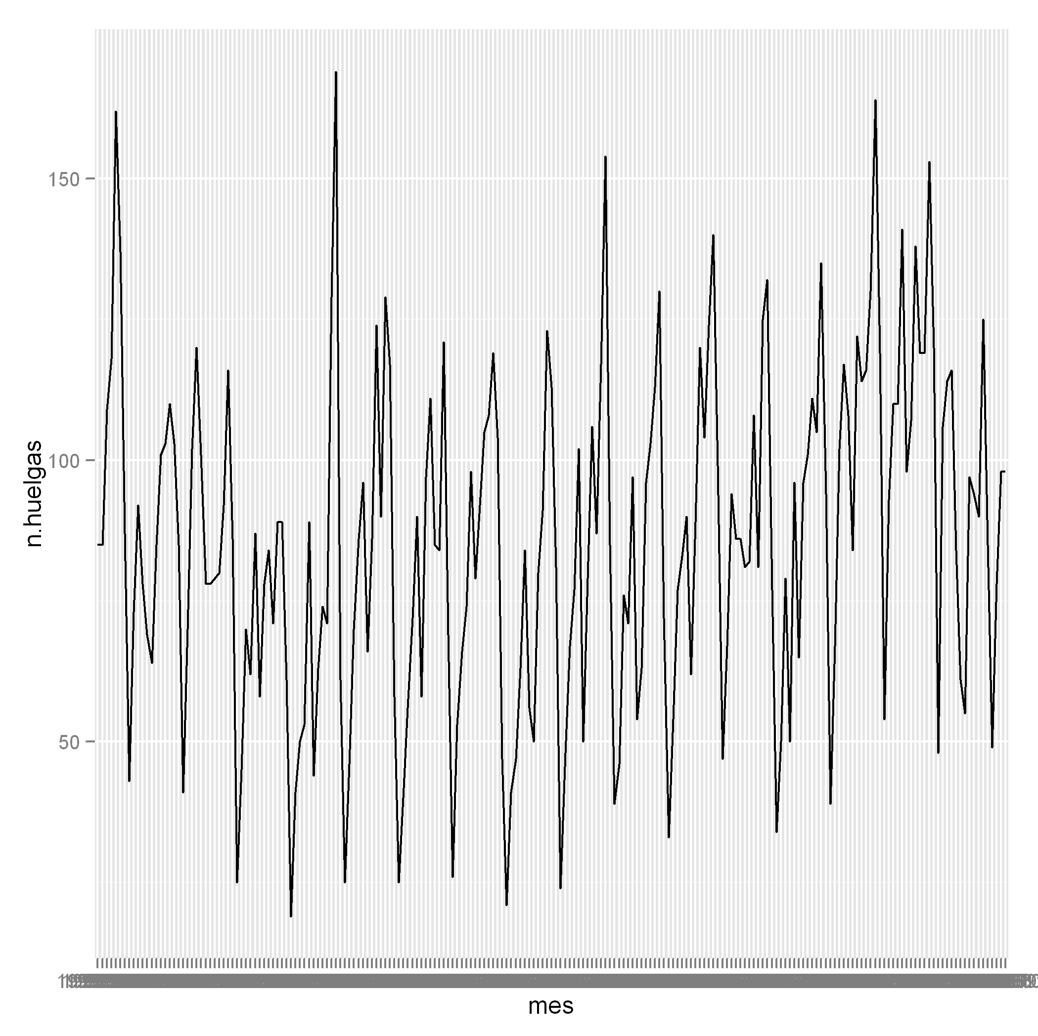 p <- ggplot(data = dat.mes) + geom_line(aes(x = mes, y = n.huelgas, group = rep(1, nrow(dat))))