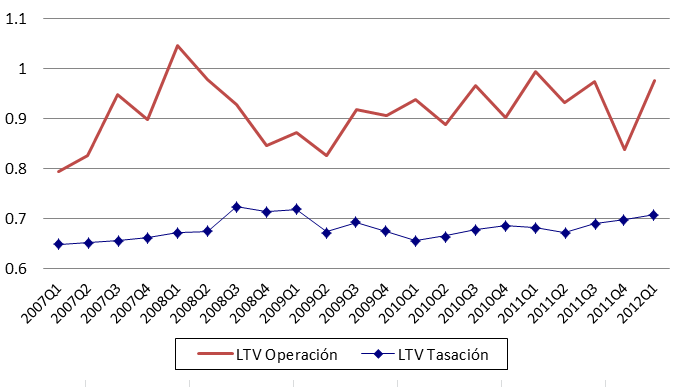 (Este LTV tiene que ver con el famoso le financiamos el 80% del valor de la inversión de otras épocas. Un préstamo con un LTV bajo es seguro: el banco puede con más o menos facilidad recuperar el 100% del capital prestado; un préstamo con un LTV alto es mucho más problemático.)