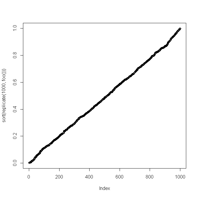 Este gráfico pone de manifiesto que los p-valores obtenidos siguen una ley uniforme (en [0,1]) tal y como cabe esperar de la teoría. Porque el p-valor no es otra cosa que $F^{-1}(X)$ donde en este caso, bajo la hipótesis nula, $X$ tiene la distribución dada por $F$.