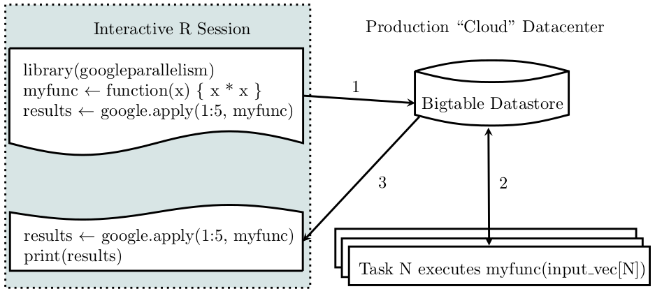 Desde una sesión no necesariamente interactiva, se lanza un proceso. La infraestructura creada por Google (la función google.apply dentro del paquete googleparallelism) entonces:
