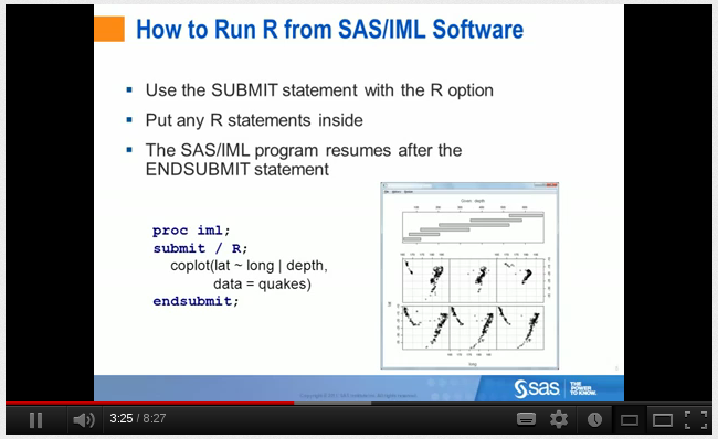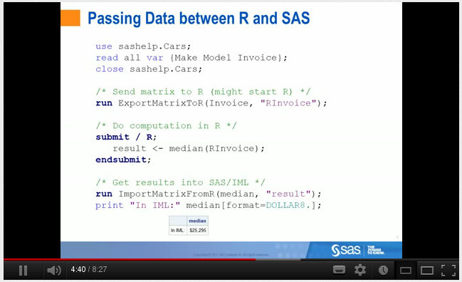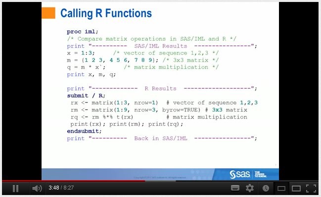Quiero dar a conocer hoy un vídeo de SAS sobre cómo integrarlo con R a través de SAS/IML. SAS/IML es un lenguaje de programación que apenas tiene que ver con lo que normalmente se conoce como el lenguaje de programación SAS y que tiene un aspecto similar a Matlab o, incluso, salvando las distancias, R. Debido a esa afinidad, es el producto a través del cual SAS ha querido establecer la interconexión de sus productos con R. Además, intuyo, de forzar a los interesados en dicha integración a adquirir una licencia de IML.