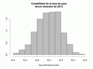 en el que se muestra en qué rangos podría estar variando la tasa de paro recogida por el INE si el azar hubiese hecho que los entrevistados fuesen otros que los unos que eligió finalmente el INE en 1000 universos paralelos idénticos al nuestro salvo por ese pequeño detalle. Los resultados no son escandalosamente distintos de los que con cuatro cifras significativas reificaron los medios pero pone en cuestión nuestra manía por la ultraprecisión.