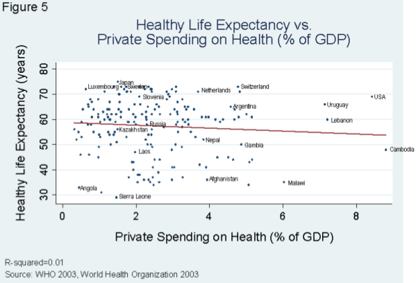 Nótese que al recortar los gráficos he mantenido el pie, en el que se informa de cómo la R² de la regresión de la esperanza de vida sobre el porcentaje de gasto sanitario privado es ¡del 1%!