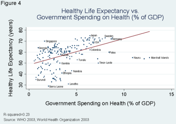que da cuenta de la regresión de la esperanza de vida sobre variables tales como la eficacia del gobierno, los porcentajes del PIB invertidos en salud a través de agentes públicos o privados y, finalmente, el PIB per cápita. Lo que se lee en ella es, esencialmente, que las variables que más influyen en la esperanza de vida son la primera y la última. Y que el color del gato (color público o privado) influye más bien poco en si este caza o no ratones.