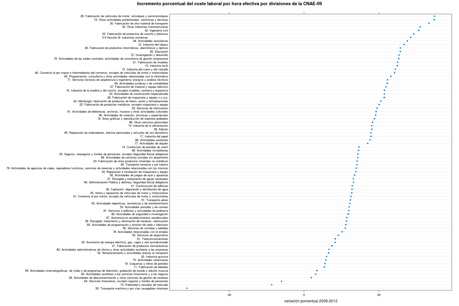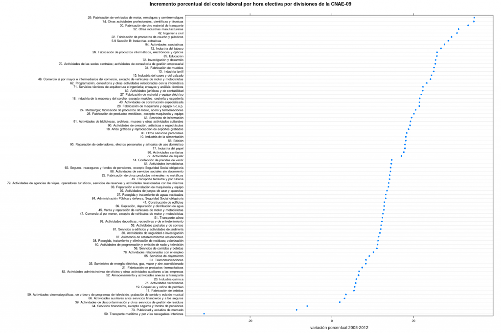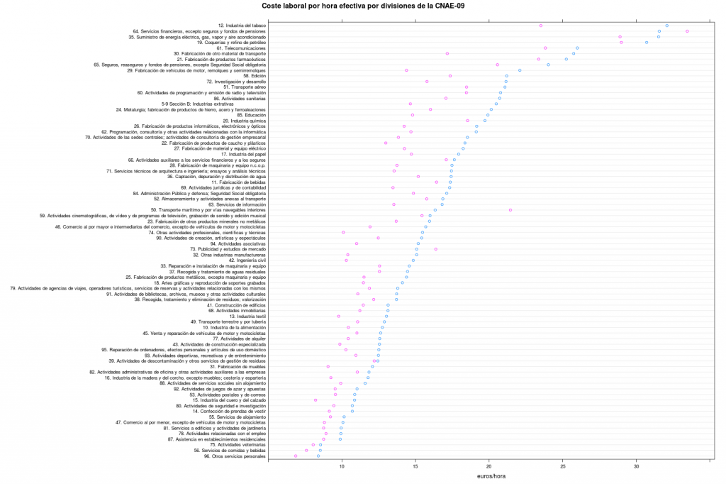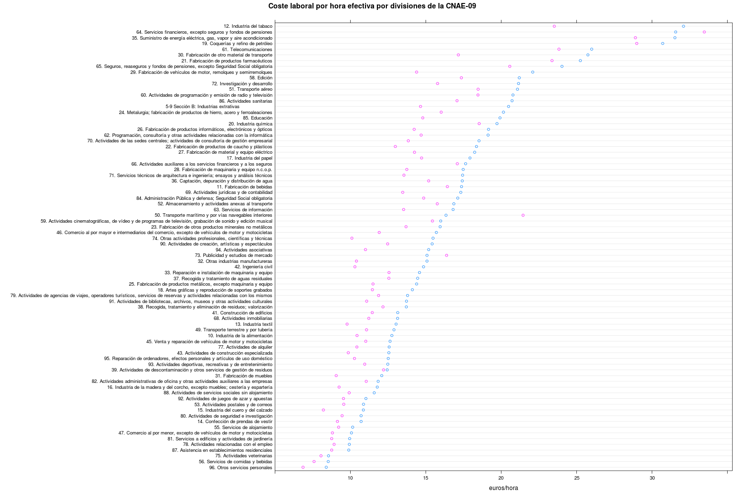 Lo que voy a hacer es mostrar un par de gráficos construidos sobre los datos (agregados: da la impresión de que el INE no proporciona los microdatos) de la última Encuesta Trimestral de Coste Laboral correspondiente al tercer trimestre de 2012. De entre todas las opciones, me he decantado por indagar sobre el coste laboral por hora efectiva y por divisiones de la CNAE-09. Lo resumo en el siguiente gráfico: