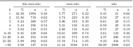 De hecho, sabidos el municipio, el sexo y de la fecha ya sea solo el año, el año y el mes o año, mes y día, el grado de k-anonimidad viene dado por la siguiente tabla: