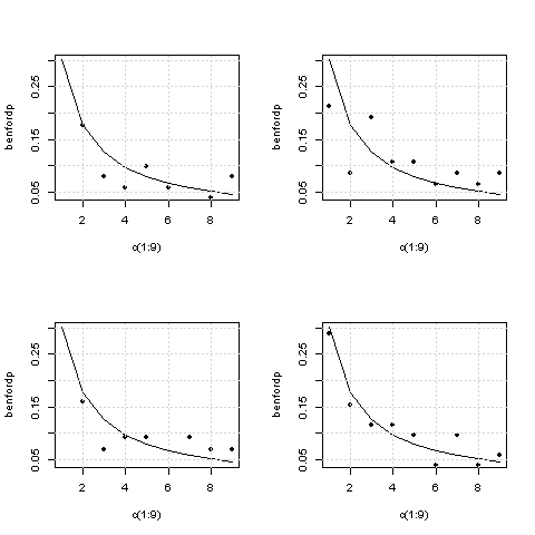 donde se aprecia cómo, efectivamente, dichas cifras parecen adecuarse a la Ley de Benford. (Hay que hacer notar, sin embargo, que el test implementado por Gregorio, el de la chi-cuadrado, arroja un p-valor de 2.2e-16, que podría llevar a algunos a cuestionar si lo que ven sus ojos es cierto y a otros a divagar sobre la aplicabilidad de pruebas de este tipo a conjuntos de datos tan grandes).