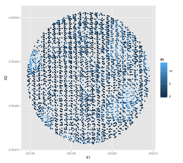 ggplot(xyz, aes(x = X1, y = X2, col = X3)) + geom_point()… que produce: