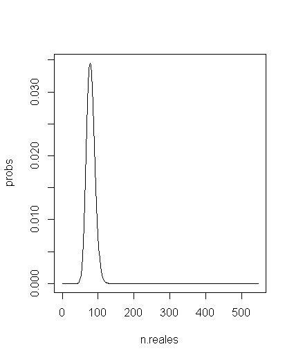 probs <- sapply(n.reales, function(y) dhyper(x, y, N-y, n, log = FALSE))