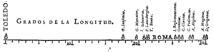 He querido hacerlo por dos motivos. El primero, que según Tufte (y otros) se trata del primer gráfico estadístico propiamente dicho del que se tiene noticia. Es una especie de diagrama de puntos básico en el que se representan distintas estimaciones de la distancia en grados entre Toledo y Roma. Reconozco los nombres de, p.e., Mercator y Regiomontano entre los autores de algunas de ellas. El objetivo de su autor, Michael van Langren, era el de ilustrar la enorme variabilidad de las estimaciones realizadas hasta la fecha para justificar la necesidad de una nueva, suya, más precisa.
