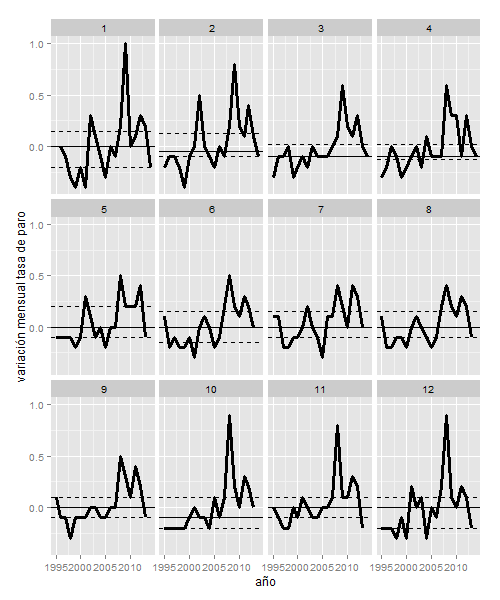 Cada recuadro corresponde a un mes (identificado por su número, obviamente). El eje horizontal, son los años desde el principio de la serie. La serie temporal, como indico arriba, es la diferencia del valor de la tasa de desempleo del mes con el anterior. Las líneas horizontales son los cuartiles de las deltas del mes en cuestión. Y mil perdones a todos mis lectores que no sean directivos por explicarles la gráfica como si fuesen tontos.