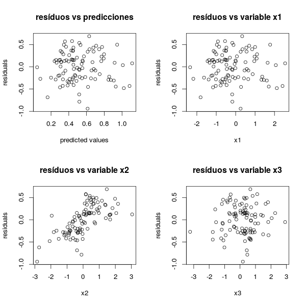 En ninguno de los gráficos de la primera fila (residuos contra predicción y variable explicativa) se aprecian artefactos. Tampoco en el de la esquina inferior derecha (residuos contra una variable que, por construcción, es independiente de y). Sin embargo, al ordenar los residuos según la variable x2, se aprecia una irregularidad. En efecto, el intercepto cambia según x2>0 o no.