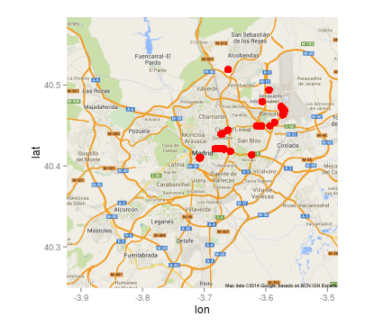 Dentro de Madrid me traza por los alrededores de mi casa, en el aeropuerto y entre la una y el otro. Así de triste es mi vida. Hay un punto raro en el que no recuerdo haber estado en los últimos tiempos. Faltan algunos puntos por los alrededores de la ciudad universitaria por donde anduve este verano y el DataBeers de la semana pasada. ¡Apenas he estado en ningún otro sitio en los últimos meses!
