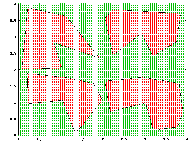 - la distribución de colores no está perfectamente delimitada por ningún tipo de poligonal artificiosa sino en cada región del espacio uno encuentra puntos de cada color (de otra manera, de las distribuciones de colores no tienen soporte disjunto).