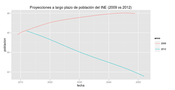 Finalmente, déjeseme comparar las previsiones digo estimaciones digo operaciones del INE realizadas en 2009 con las del 2012 (y poniendo, además, el origen del eje y donde le ha dado la gana a ggplot2):