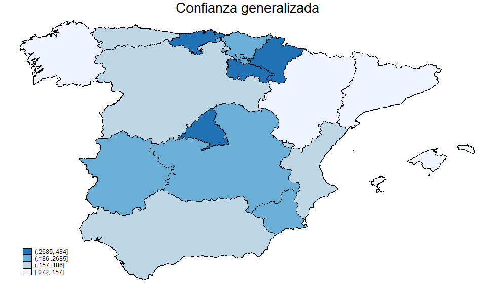 Confianza generalizada: Numerosos estudios han demostrado que el grado de “confianza generalizada” en una sociedad está fuertemente correlacionado con el desarrollo económico. Esta variable se mide con las respuestas a la pregunta: “En general, ¿diría usted que la mayoría de la gente es de fiar, o que hay que tener mucho cuidado en el trato con otra gente?”. De los encuestados en España,solo el 19% afirmaba que la mayoría de la gente es de fiar. El mapa siguiente muestra considerable variación entre regiones (en todos los mapas, los cuatro colores dividen las regiones en cuartiles). El grado de confianza es relativamente bajo en Galicia, Cataluña, Aragón y Baleares, y alto en Madrid, Cantabria, La Rioja y Navarra.