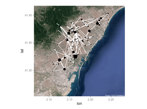 En lo que sigue voy a representar esa red sobre una capa con referencias geográficas usando ggmap y un paquete oscuro, [popgraph](http://cran.r-project.org/web/packages/popgraph/index.html), que hace muchas más cosas de las que anuncia.