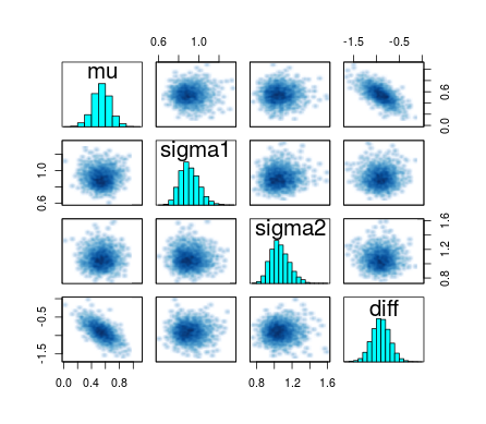 pairs(fit, pars=c("mu", "sigma1", "sigma2", "diff"))produce