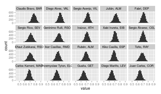 Siguiendo a Gelman et al., una manera de estimar las diferencias entre parejas de porteros sería encontrar el porcentaje de simulaciones en que el estimador de la habilidad de uno de ellos supera al del otro: