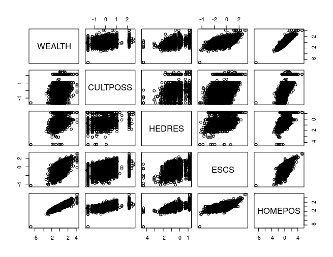 plot(dat[, c("WEALTH", "CULTPOSS", "HEDRES", "ESCS", "HOMEPOS")])