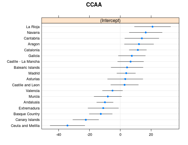 Se trata del efecto de la comunidad autónoma. Aparentemente, muy por encima, se parece a la gráfica anterior, pero se aprecian dos efectos singulares. El primero, que el País Vasco cae a niveles del african dummy. Y la segunda, (corred a contárselo a vuestros amigos de Podemos: veréis cómo les brilla el colmillo), que Madrid se derrumba.