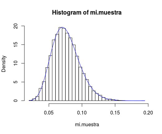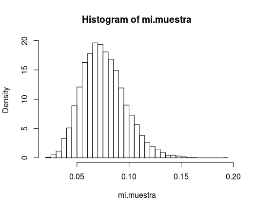 hist(mi.muestra, breaks = 50, freq = F)La pinta de la cosa es: