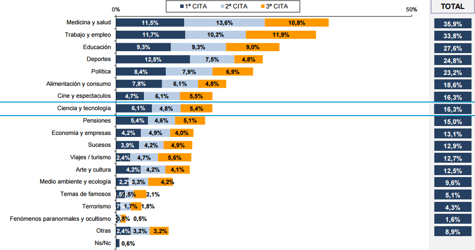Y un 16% de los fulanos/as, dizque por la ciencia y la tecnología. Mientras que solo el 5% por temas de famosos.