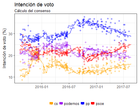 Nota metodológica: Hay una manera más sofisticada y preferible de ajustar el modelo anterior. Nótese que se calcula primero el consenso y luego el sesgo. Pero una vez obtenido el sesgo, este podría utilizarse para afinar el consenso. Etc. En definitiva, que consenso y sesgo deberían estimarse de una. Pero esto, recuerdo, es un TFM.