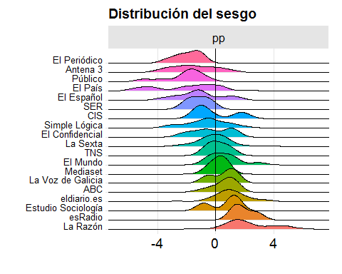 El sesgo (me limito al del PP aquí) por medio puede estimarse mediante una regresión lineal (donde la variable dependiente es la diferencia entre el valor publicado y el consenso y la independiente el medio) y no sorprenderá a nadie: