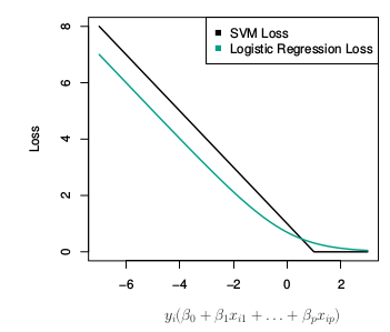 Resumiendo, en el fondo, estamos haciendo, casi, regresión logística (con o sin kernels, dependiendo de $h$) dado que las dos funciones de pérdida son, geométricamente, bastante parecidas: