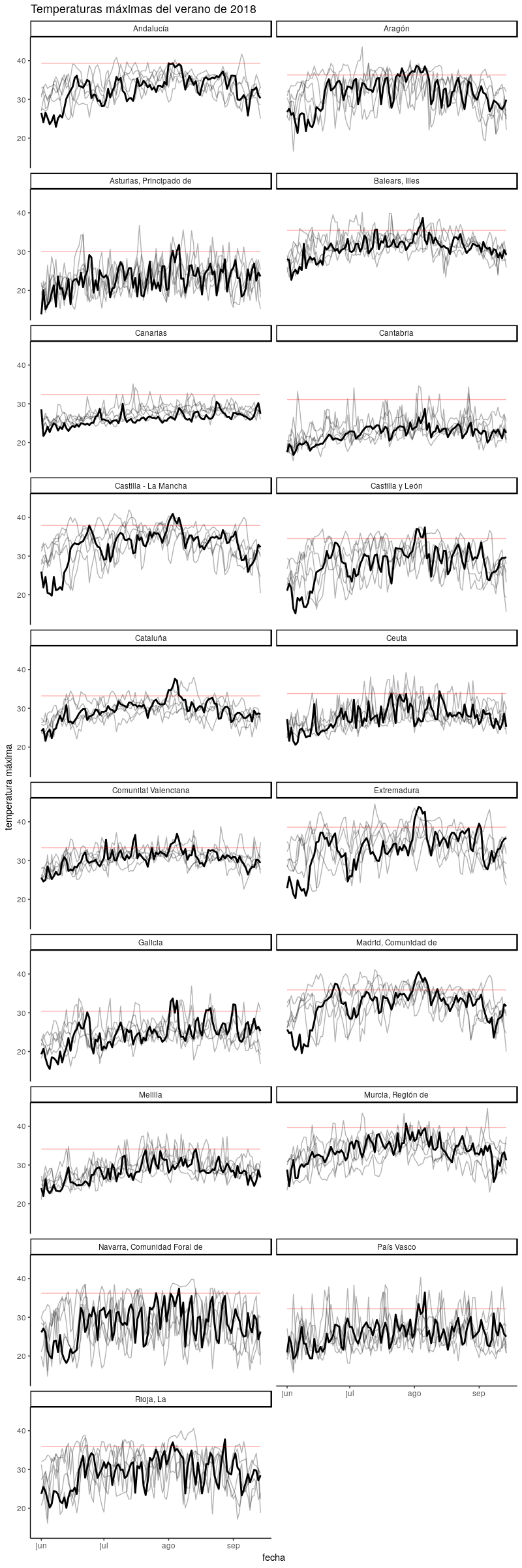 Son las del trazo grueso y las he representado sobre las de los veranos anteriores (trazo fino) para darles contexto. (Nota: no existe tal cosa como temperatura promedio, por supuesto. He partido de temperaturas provinciales (que tampoco existen, en sí mismas pero que proporciona AEMET) y he promediado ponderando por población.)